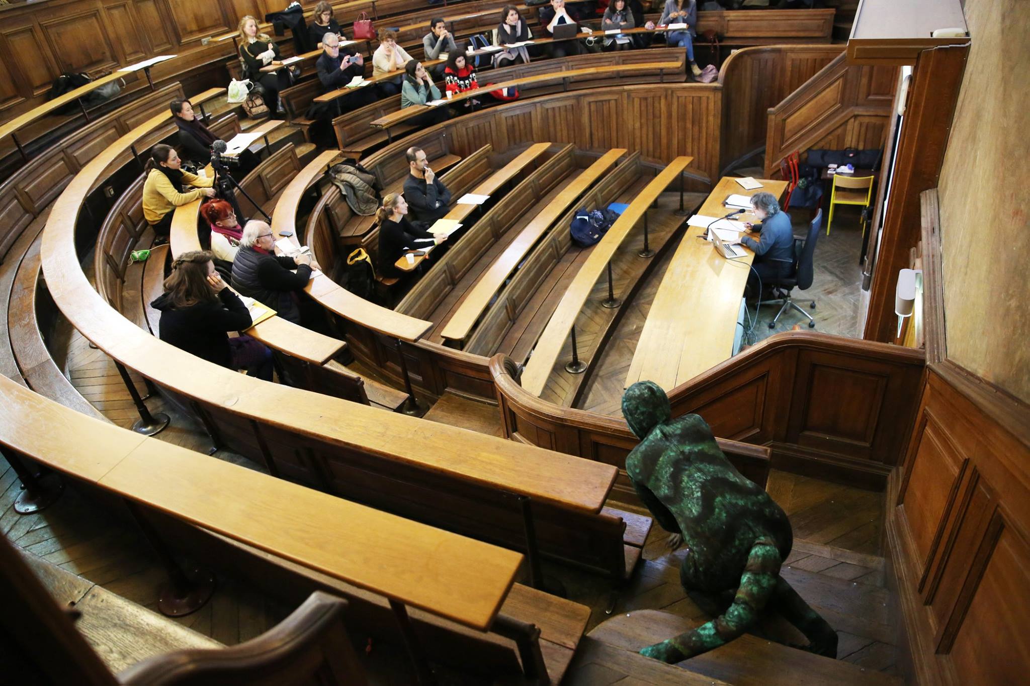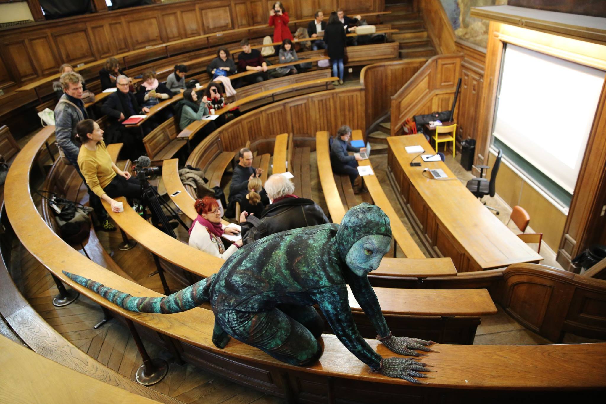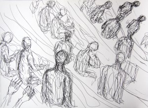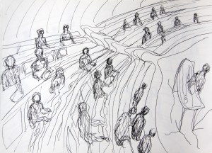 Je commençai à ramper, la sueur ruisselait sous mon masque. Je déambulai parmi un méandre de couloirs et escaliers à la recherche d’une sortie. Au bout de cette errance labyrinthique, une rampe surplombait le hall. Sur ces hauteurs silencieuses, je me posai, tout en me liant d’amitié avec le vide.