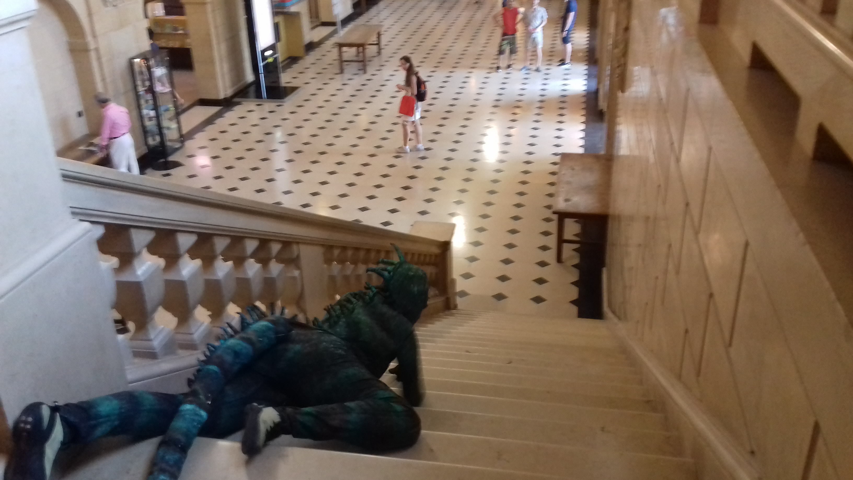 Je commençai à ramper, la sueur ruisselait sous mon masque. Je déambulai parmi un méandre de couloirs et escaliers à la recherche d’une sortie. Au bout de cette errance labyrinthique, une rampe surplombait le hall. Sur ces hauteurs silencieuses, je me posai, tout en me liant d’amitié avec le vide.