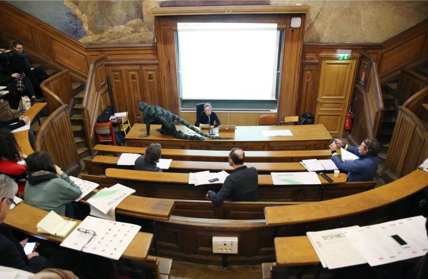 Au sein de l’amphithéâtre Bachelard de la Sorbonne, dont les sièges des auditeurs sont disposés en arc de cercle, tel que le veut la tradition, l’artiste revêtue d’un costume d’iguane, se balade entre le public. Tantôt, l’iguane marche sur leurs affaires, tantôt elle les contourne, s’arrête, se pose. Elle passe devant le public, traverse l’orateur. L’espace, dont la disposition originale est soigneusement étudiée et prévue à l’écoute, devient un terrain accidenté. Les tables deviennent des passages, la circulation s’ouvre à des nou- veaux chemins. Une toute nouvelle topologie s’offre à l’iguane.