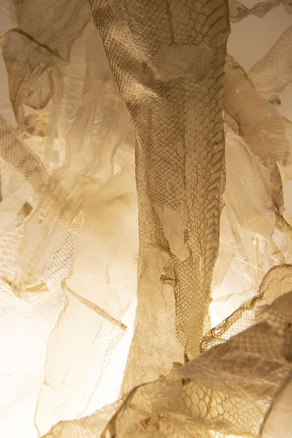 Un soir le corps inerte, dépourvu de toute chair et d’ossature, s’offre aux yeux du monde. A la lumière aveuglante, son corps translucide suspend le passage entre la vie et la mort. Un soupir entre deux mondes, celui du visible et de l’invisible, celui des vivants et des morts. Des empreintes de corps enveloppent le vide et des mues de serpents s’entremêlent et se nourrissent au pied de cette exuvie.