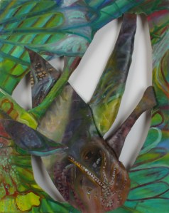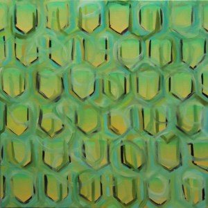 Dans mes toiles, les tonalités se distinguent et se ressemblent, les lignes et les formes se repètent et se superposent jusqu’à noyer le dessin. Les toiles elles-mêmes sont coupées et regroupées, par la superposition, la couture et le collage. Les motifs, sont l’abstraction de motifs existants dans la nature. Je l’ai appelée Epiphyte en résonance avec ces arbres «étrangleurs ».